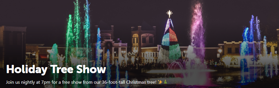 Nightly free Christmas light show in downtown OWA. OWA's 36-foot-tall Christmas tree will put on synchronized music and a light show to favorite holiday tunes. It runs from November 23 to December 15 at 7 pm over the weekends, then nightly from December 19 to 23. Check out the OWA website for a complete listing of OWA holiday events.